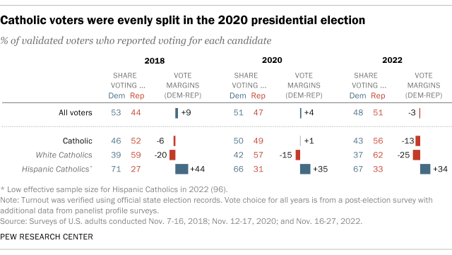 In the 2022 congressional midterm elections, 56% of Catholics said they voted for Republican candidates, while 43% backed Democrats. And in the 2020 presidential election, Catholic voters were split down the middle: 49% backed Donald Trump and 50% voted for Joe Biden.