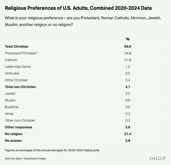 Still, the majority of Americans—69%—continue to identify with a Christian denomination. Only 4% adhere to non-Christian faiths, including Judaism (2.2%), Mormonism (1.5%), and smaller proportions for Islam, Buddhism, Hinduism, and Orthodox Christianity. Another 6% identify as “spiritual” or offer no specific answer at all.