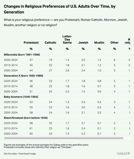 Importantly, this evolution is not «only» the result of generational turnover. Even within each age cohort, more adults have shifted toward religious disaffiliation over time. In Generation X, baby boomers, and the Silent Generation, Gallup notes a consistent pattern: every decade, the share of “nones” increases by two to three points. Among millennials, that increase is even sharper—an eight-point jump in the 2000s, followed by seven more points in the last ten years.