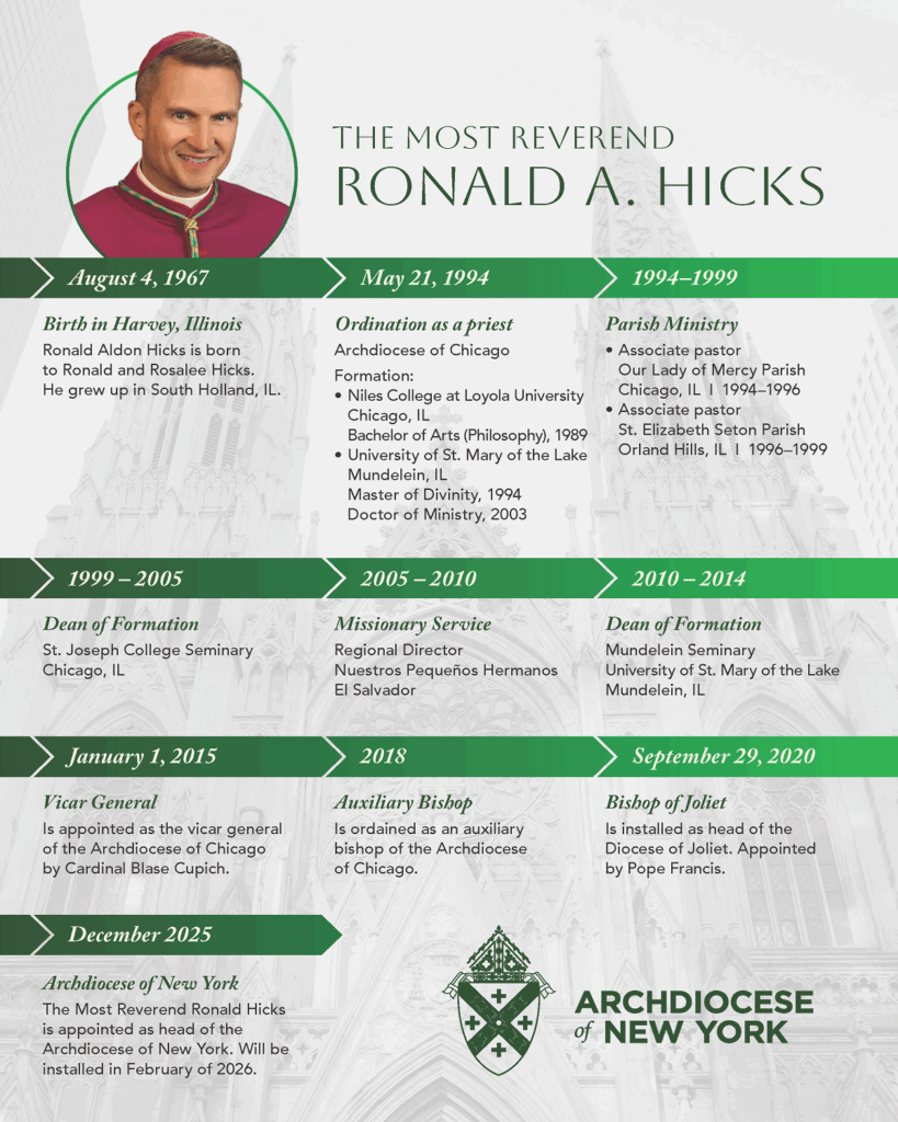 On December 18, Pope Leo XIV accepted the resignation of Cardinal Timothy Dolan, who had led the Archdiocese of New York for nearly seventeen years, and named Hicks, the bishop of Joliet, Illinois, as his successor. Hicks, 58, will be installed on February 6 as the eleventh archbishop of New York, assuming pastoral responsibility for roughly 2.5 million Catholics spread across New York City and seven surrounding counties.