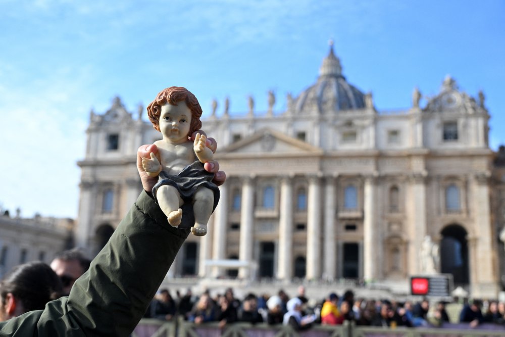 A person holds a Nativity Scene figurine of baby Jesus before the traditional blessing of figurines as part of the pope’s Sunday Angelus prayer before Christmas in Saint Peter’s Square in the Vatican on December 21, 2025. (Photo by Andreas SOLARO / AFP via Getty Images)