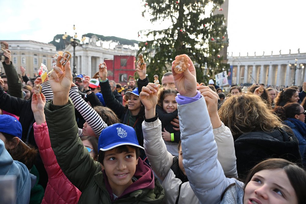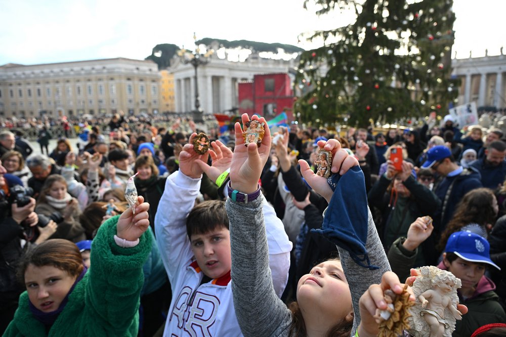 Children hold a Nativity Scene figurine of baby Jesus before the traditional blessing of figurines as part of the pope’s Sunday Angelus prayer before Christmas in Saint Peter’s Square in the Vatican on December 21, 2025. (Photo by Andreas SOLARO / AFP via Getty Images)