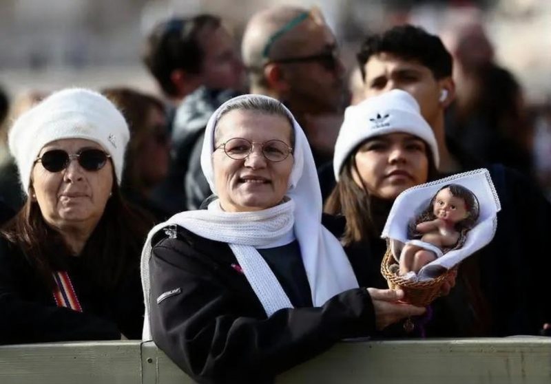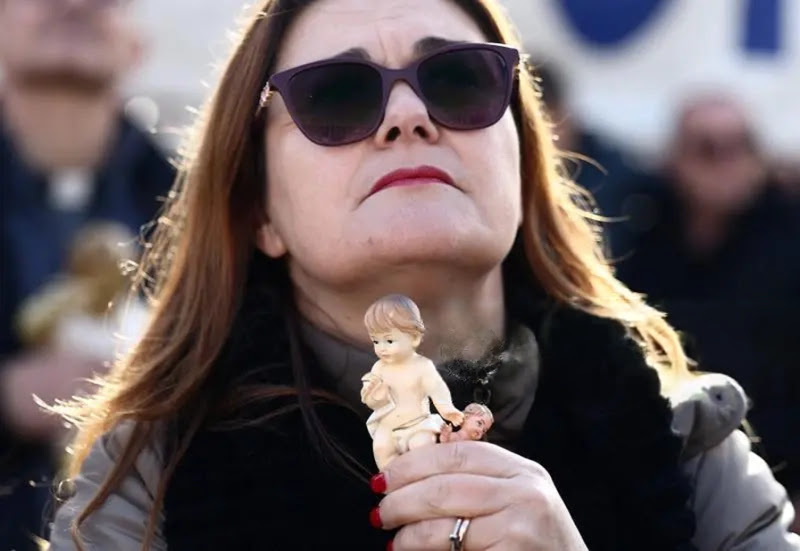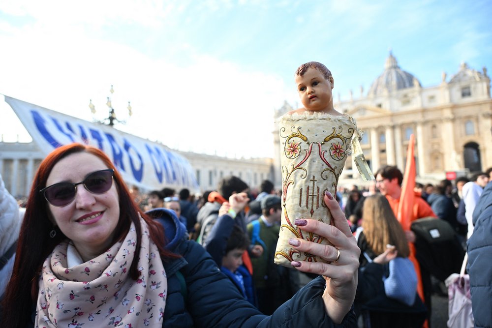 A woman holds a Nativity Scene figurine of baby Jesus before the traditional blessing of figurines as part of the pope’s Sunday Angelus prayer before Christmas in Saint Peter’s Square in the Vatican on December 21, 2025. (Photo by Andreas SOLARO / AFP via Getty Images)