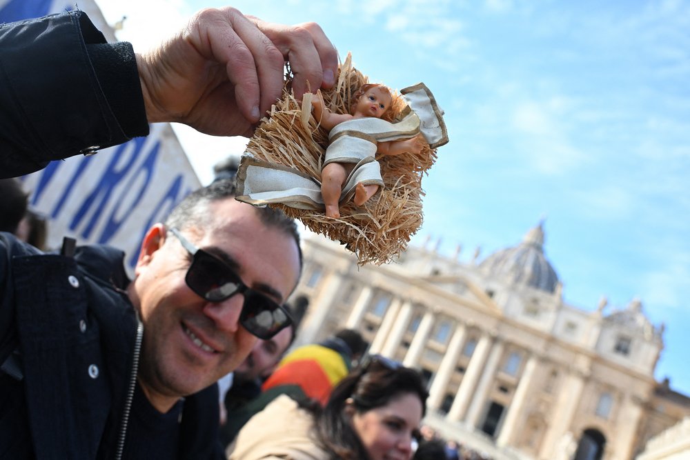 A man holds a Nativity Scene figurine of baby Jesus before the traditional blessing of figurines as part of the pope’s Sunday Angelus prayer before Christmas in Saint Peter’s Square in the Vatican on December 21, 2025. (Photo by Andreas SOLARO / AFP via Getty Images)