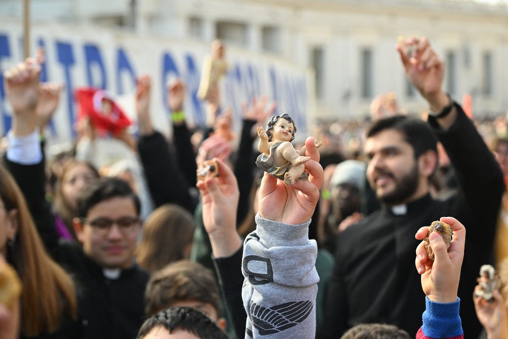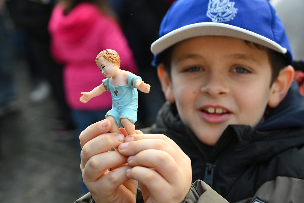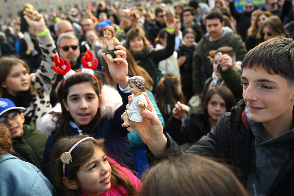 A child holds a Nativity Scene figurine of baby Jesus before the traditional blessing of figurines as part of the pope’s Sunday Angelus prayer before Christmas in Saint Peter’s Square in the Vatican on December 21, 2025. (Photo by Andreas SOLARO / AFP via Getty Images)