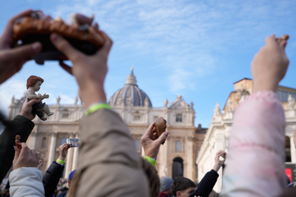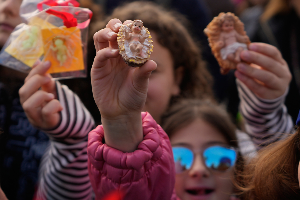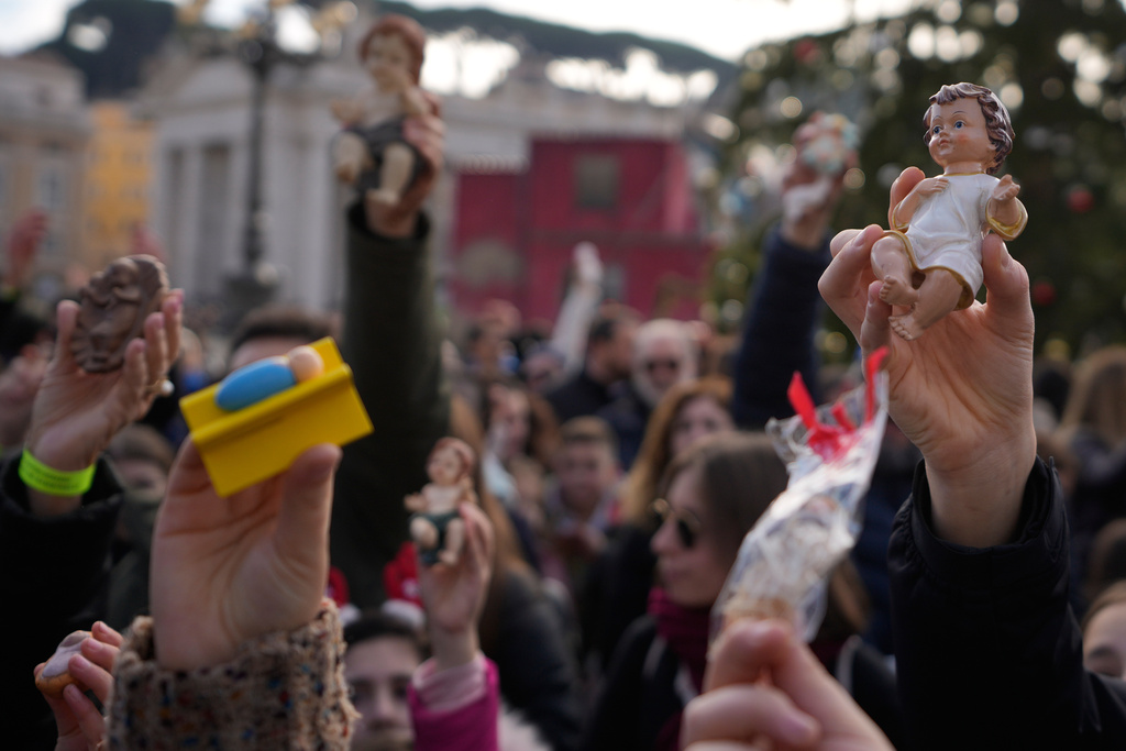 Faithful hold up statuettes of baby Jesus prior to the start of Pope Leo XIV Angelus noon prayer in St. Peter’s Square, at the Vatican, Sunday, Dec. 21, 2025. (AP Photo/Gregorio Borgia)