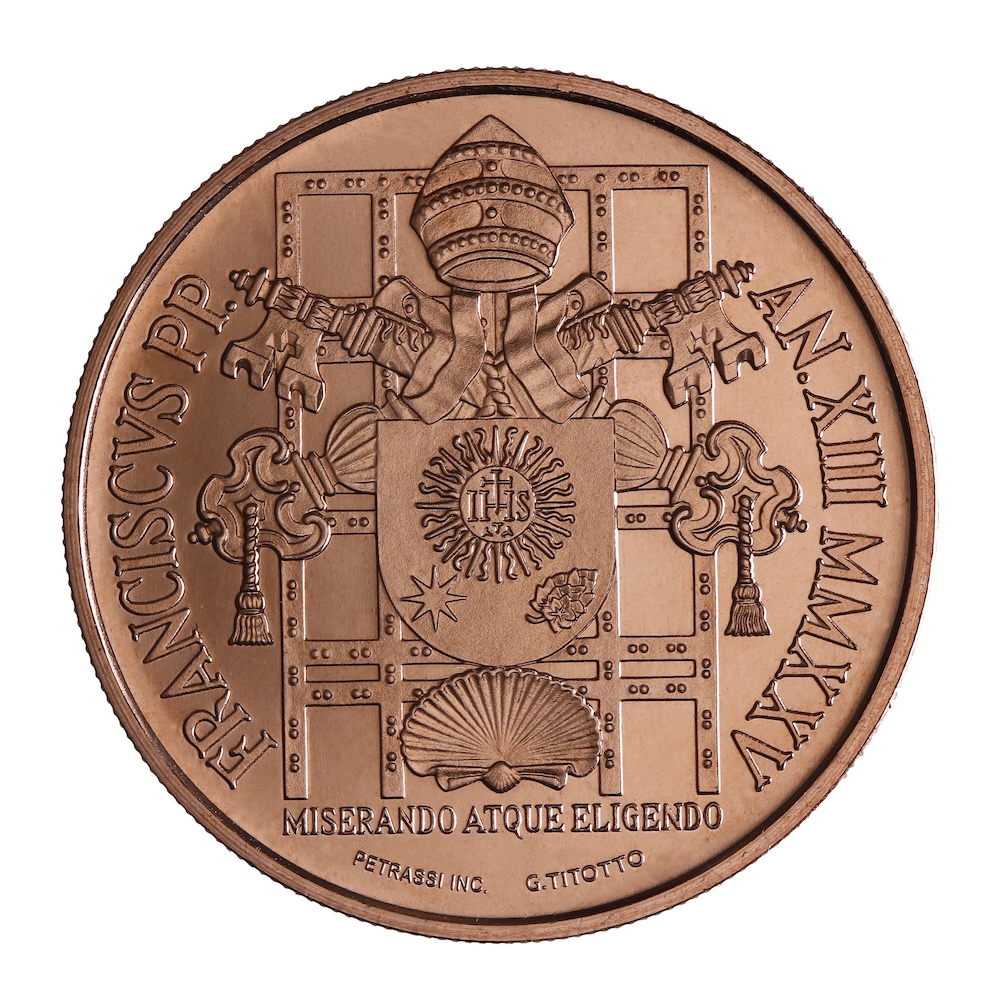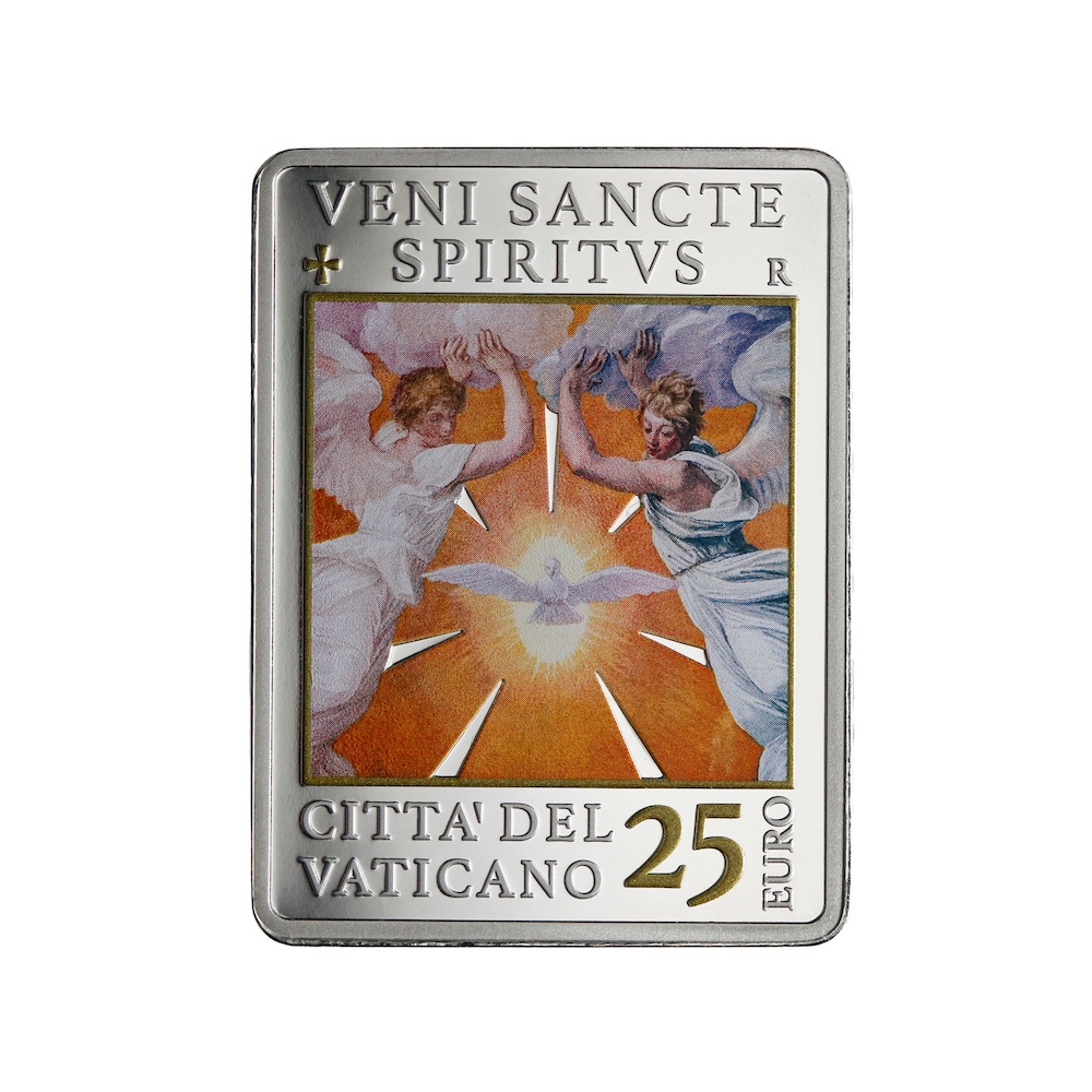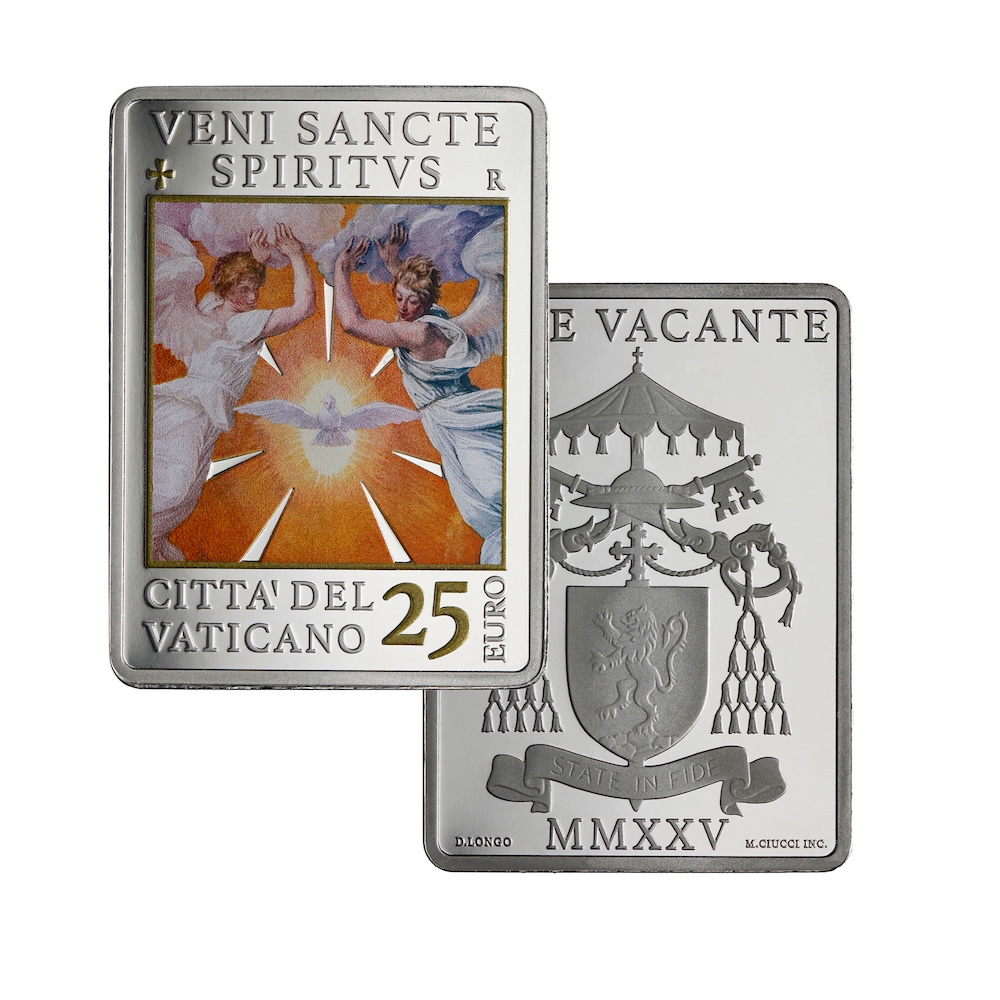 The journey concludes with the 25-euro colored silver coin dedicated to the Sede Vacante MMXXV, the last of three issues devoted to this theme. The iconography, inspired by “The Descent of the Holy Spirit” by Guido Reni, places at its center the dove of the Holy Spirit, surrounded by a choir of angels, as a sign of divine guidance in a time of anticipation. On the obverse stands the coat of arms of the Cardinal Camerlengo, entrusted with the administration of the Apostolic See during the Sede Vacante, as a sign of institutional continuity and faithful ecclesial service.