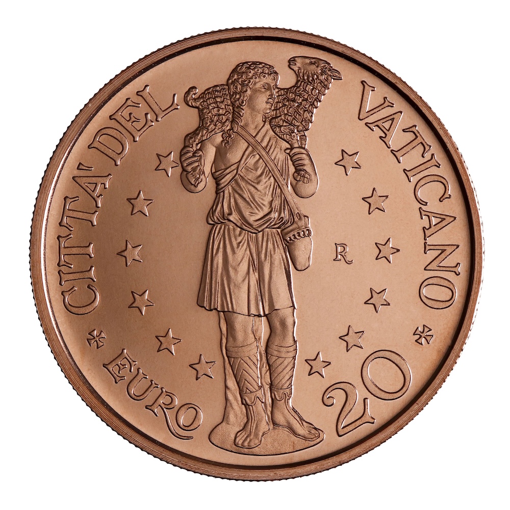 The Jubilee message of mercy finds further expression in the 20-euro copper BU coin “Art and Faith: The Good Shepherd”. The reverse presents the Gospel image of the Shepherd carrying the lost sheep upon his shoulders, a vivid and powerful representation of the love with which Christ cares for humanity. On the obverse, the papal coat of arms is set within a composition recalling the structure of the Holy Door, establishing a refined iconographic reference to the Holy Year and the spiritual meaning of pilgrimage.