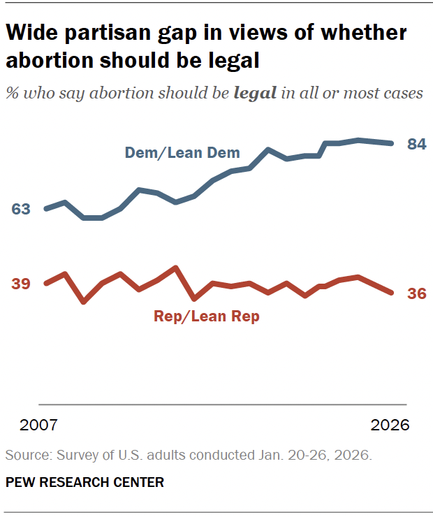 Yet beneath this apparent stability lies a deepening polarization. The modest drop in support is concentrated entirely among Republicans and Republican-leaning independents. Today, only 36 percent of Republicans say abortion should be legal in most or all cases, down from 41 percent two years earlier. Among Democrats, by contrast, attitudes have remained strikingly consistent: since 2022, at least 84 percent have supported legal abortion.