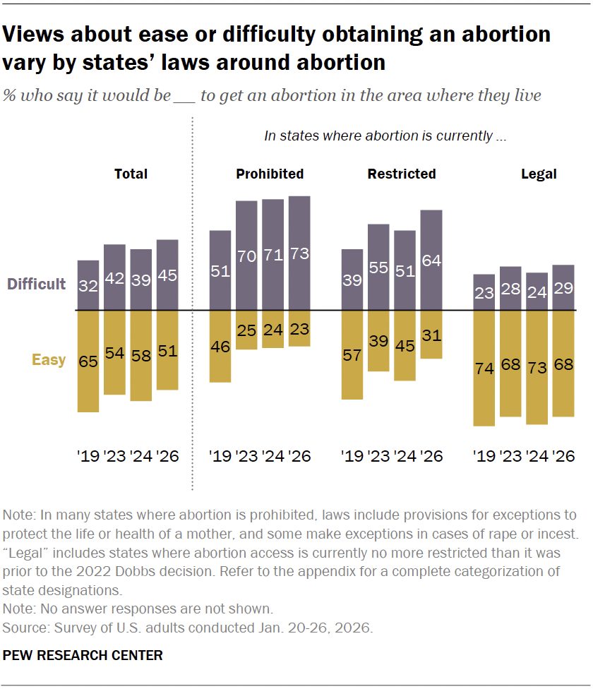 Geography has become the decisive factor. In states where abortion is banned, 73 percent of residents say it is difficult to obtain the procedure. In states with gestational limits—ranging from six to twenty weeks—64 percent report difficulty, compared with 31 percent who say access is easy. By contrast, in states where abortion remains broadly legal, including beyond 24 weeks in some cases, 68 percent describe access as easy. These patterns hold across party lines, suggesting that personal experience of local laws shapes perception regardless of political affiliation.
