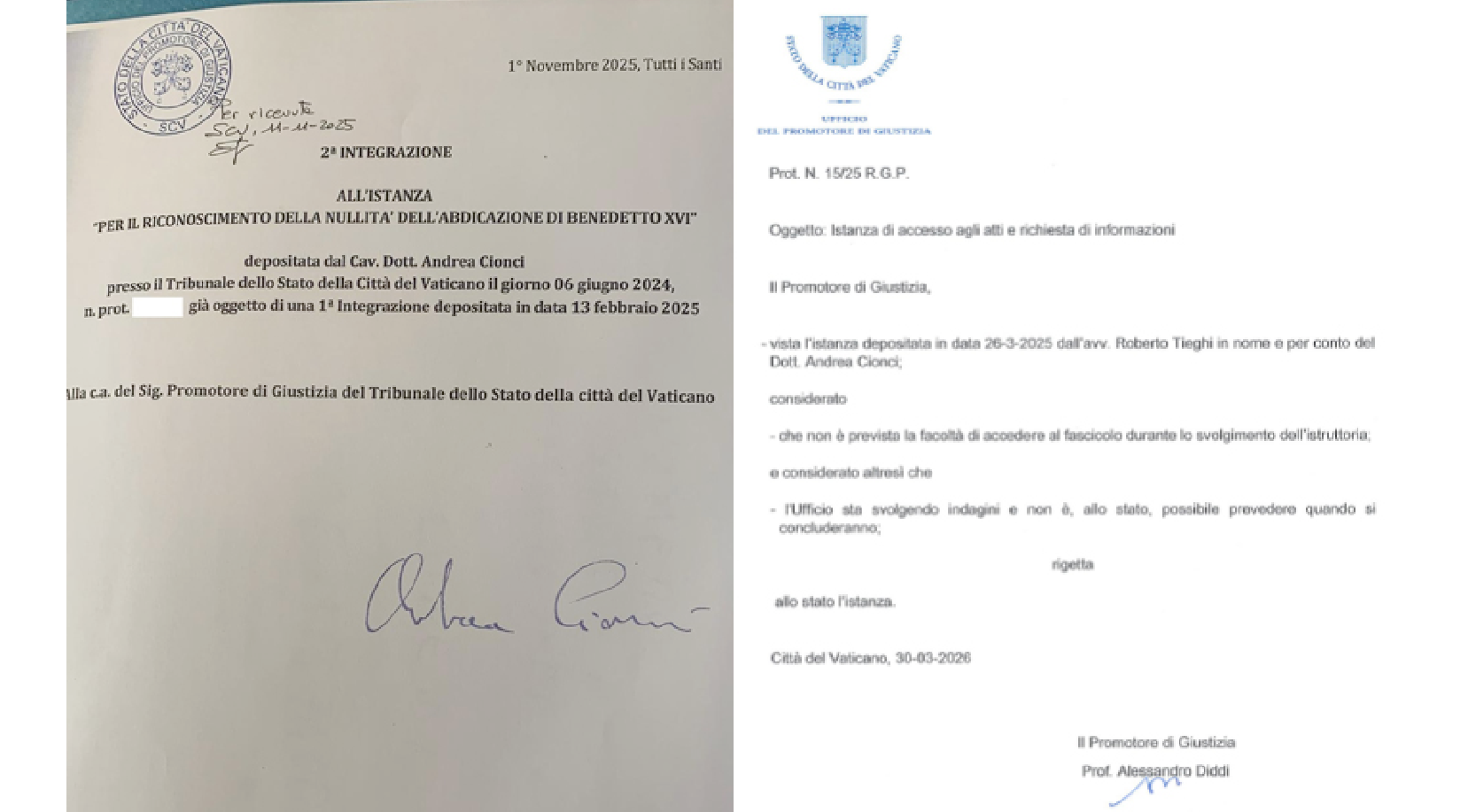 The case originates from a formal petition submitted on 6 June 2024 by Andrea Cionci, supported by lawyer Roberto Tieghi and accompanied by numerous signatures. The request asked the Vatican Tribunal to examine the validity of Benedict XVI’s decision to resign the Petrine ministry. At the heart of the initiative lies a theory that has circulated for years in certain circles: the claim that Benedict never truly abdicated and that his successor, Pope Francis, would therefore be an illegitimate occupant of the See of Peter.